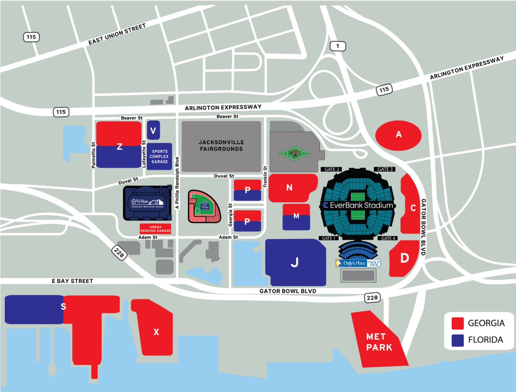 Guests will be able to access post-game pick-up for Lot S, Lot X and Lot Z via the Jacksonville Veterans Memorial Wall. Guests parked in Met Park will be able to access post-game pick-up via Lot D.